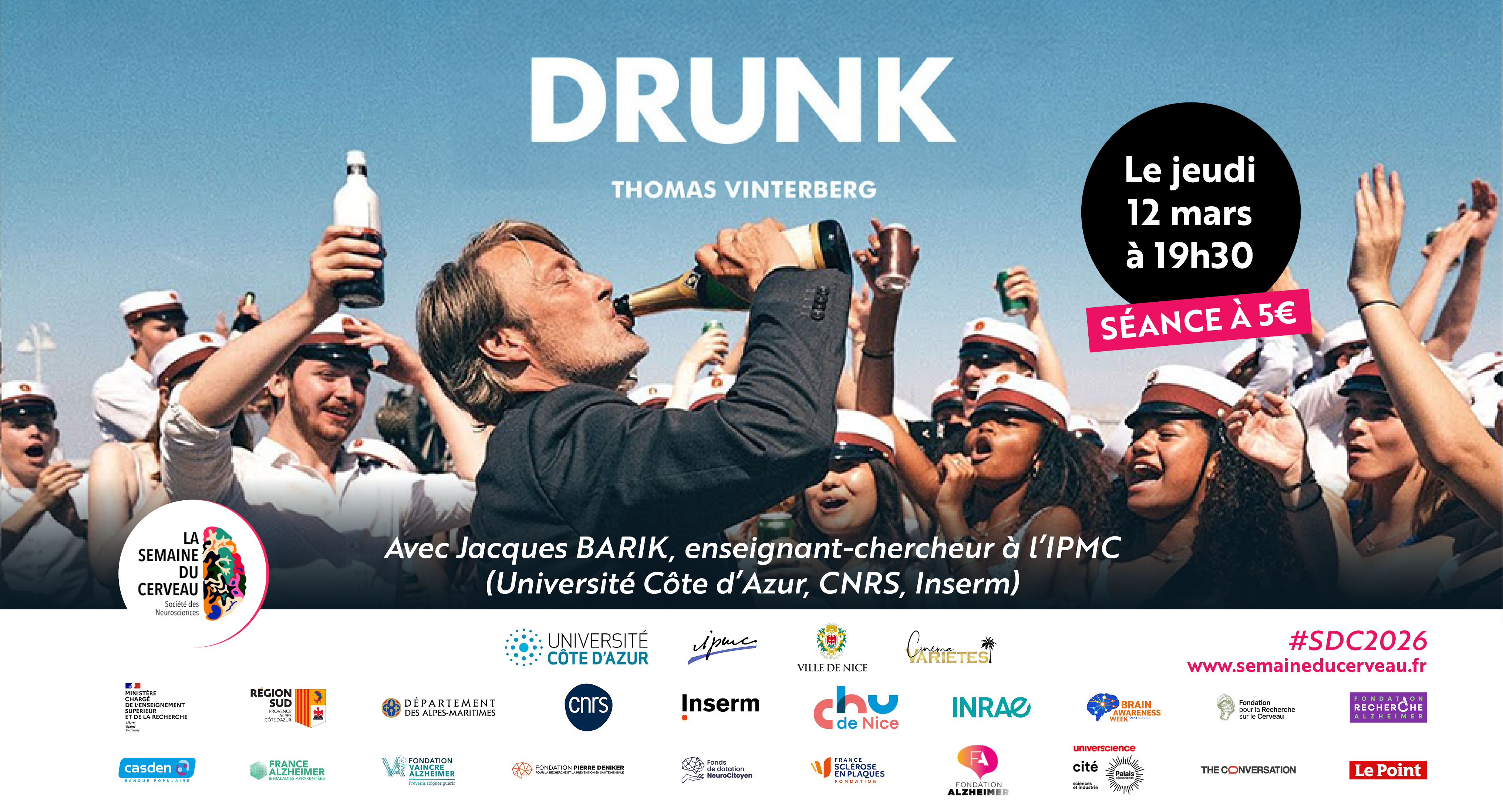 La projection sera suivie d’un échange avec Jacques Barik, chercheur CNRS à l’Institut de Pharmacologie Moléculaire et Cellulaire (IPMC – Université Côte d’Azur, CNRS, Inserm). Spécialiste des mécanismes cérébraux impliqués dans les comportements et les addictions, il apportera un éclairage scientifique sur les effets de l’alcool sur le cerveau et répondra aux questions du public.