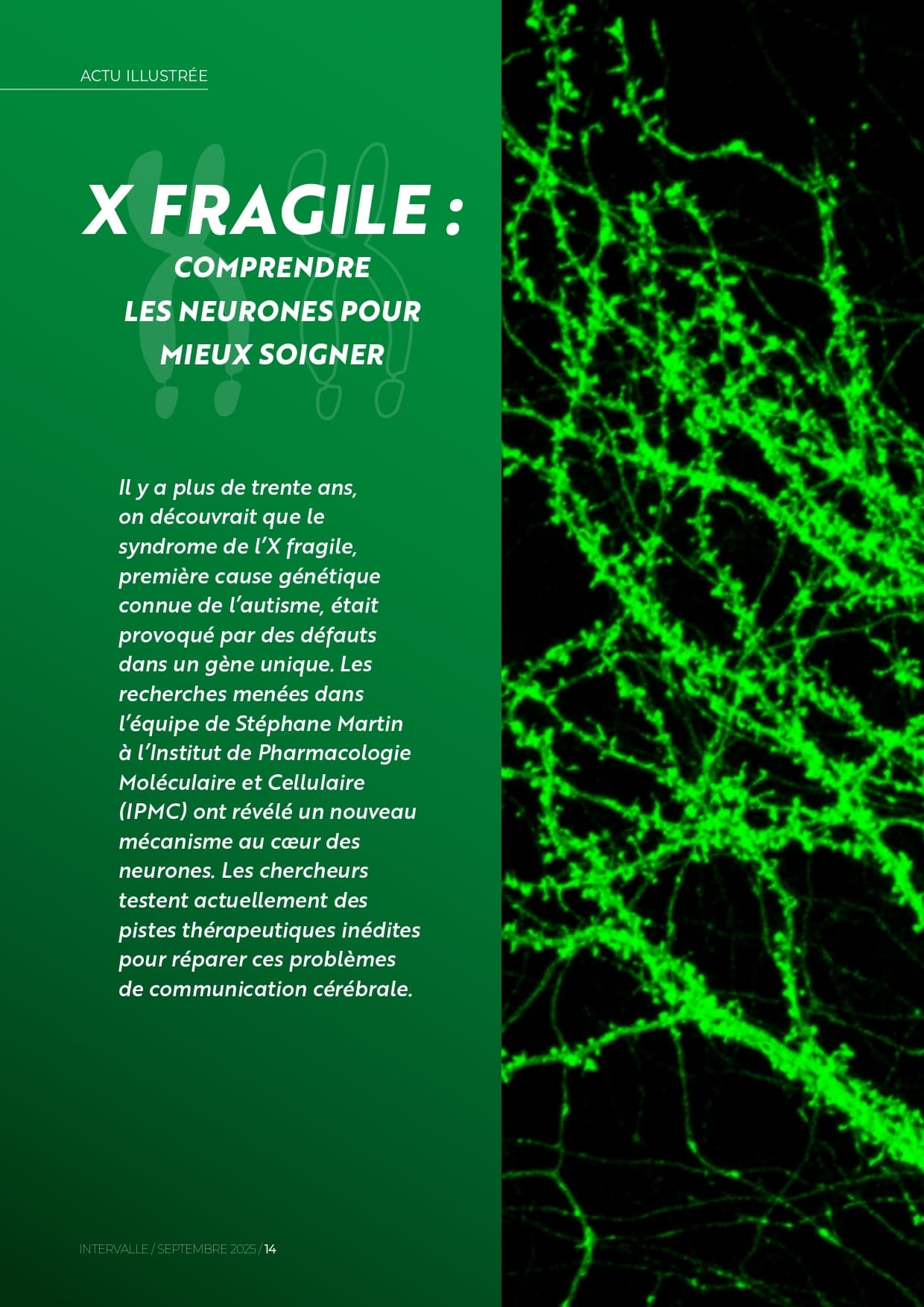 La déficience intellectuelle et les troubles du spectre autistique sont les causes majeures de handicap chez l’enfant et un enjeu essentiel de santé publique. Le syndrome de l’X-fragile est la forme héréditaire la plus fréquente de déficience intellectuelle et la première cause génétique connue de troubles du spectre autistique. Cette maladie du neurodéveloppement est due à la mutation d'un seul gène, le gène FMR1 sur le chromosome X. Cette maladie résulte donc du non fonctionnement du produit de ce gène FMR1, la molécule FMRP. Celle-ci est naturellement exprimée dans le cerveau. Elle lie et transporte des milliers d’ARN messagers, c’est-à-dire des composés (acide ribonucléique) qui portent l'information génétique nécessaire à la synthèse des protéines de la cellule, jusqu’aux sites où ces ARN seront traduits en protéines. Ces étapes sont essentielles pour établir les connexions entre les cellules nerveuses ou neurones qui composent le cerveau. L'équipe de recherche a mis en évidence un mécanisme de régulation de la fonction de transport d’ARNm de FMRP.