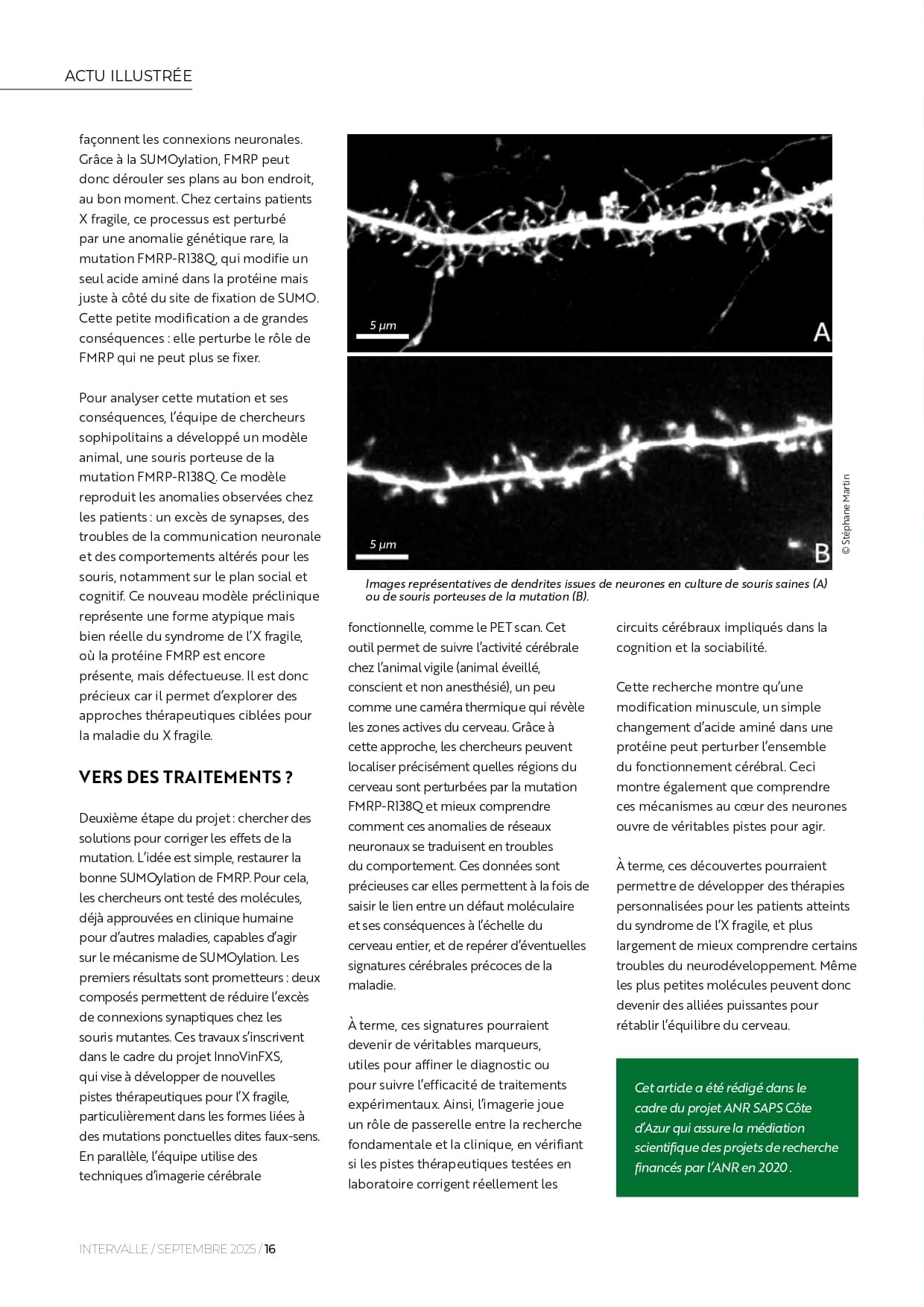 - La deuxième partie du projet a pour but d’élaborer des solutions pour corriger les anomalies fonctionnelles induites par la mutation FMRP-R138Q. Pour cela, l'équipe cible le mécanisme de SUMOylation afin de rétablir la capacité de FMRP à contrôler la densité de connexions neuronales qui est défectueuse dans notre modèle de souris comme chez les patients atteints de X-Fragile. Le but est ici d’employer des molécules déjà utilisées en clinique humaine pour d’autres pathologies et ciblant le mécanisme de SUMOylation afin d’évaluer leur potentiel thérapeutique sur notre modèle d’étude. Les résultats préliminaires sont encourageants puisque parmi les molécules testées, deux d’entre elles présentent des activités intéressantes en diminuant l’excès de connexions cérébrales chez le modèle FMRP-R138Q. A terme, l'équipe de recherche espérent pouvoir valider ces approches pharmacologiques sur notre modèle préclinique et ainsi élaborer des stratégies pour le développement de nouvelles pistes thérapeutiques du syndrome de l’X fragile.